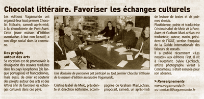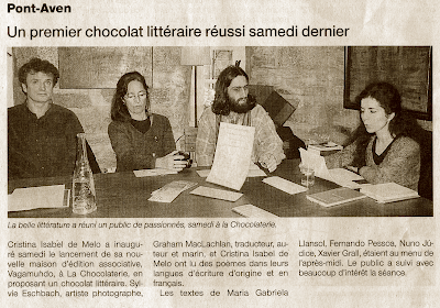 O chocolate literário de Pont-Aven (de que demos notícia antes), uma iniciativa de Cristina Isabel de Melo e da nova editora Vagamundo, decorreu no passado sábado de forma animada, como noticia a imprensa local. As próximas leituras com chocolate, também com Llansol no menu, terão lugar na Primavera.