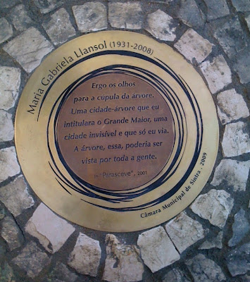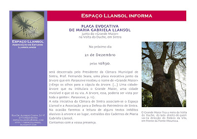 Foi hoje descerrada em Sintra, junto do «Grande Maior», na Volta do Duche, a placa que assinala a presença desta árvore como figura em Parasceve. Para além de membros e amigos do Espaço Llansol, estavam presentes vários vereadores e representantes de órgãos do município. Usaram da palavra, evocando Llansol, a sua Obra e a sua intervenção em defesa do património vivo de Sintra, o Presidente da Câmara, Prof. Fernando Seara, Adriana Jones (da Associação para a Defesa do Património de Sintra) e o Presidente da Direcção do Espaço Llansol.