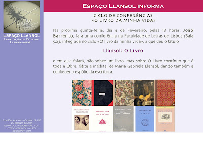 No próximo dia 16 de Janeiro Llansol será lida, em português e francês, na cidade dos pintores na Bretanha (Pont-Aven), no âmbito de uma sessão de leitura em que se poderá ouvir também poesia de Fernando Pessoa e Nuno Júdice, e ainda do poeta bretão Xavier Grall. Tudo acontecerá na Chocolaterie de Pont-Aven, por iniciativa da recém-criada Associação Vagamundo, vocacionada para a divulgação de autores lusófonos no espaço francófono e de literatura de língua francesa no espaço lusófono. A Vagamundo – o nome teve inspiração em M. G. Llansol – é uma criação de Cristina de Melo, artista plástica e tradutora francesa de Llansol, que se associou a Sylvie Eschbach (fotógrafa) e a Graham MacLachlan (escritor, tradutor e marinheiro), todos residentes na Bretanha.